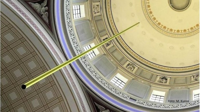 Seit Mai zieht sie in der Nikolaikirche die Blicke auf sich und macht unübersehbar auf das Jubiläumsjahr 175 Jahre Nikolaikuppel aufmerksam: Die Installation "Zwischen Himmel und Erde". Zwischen Irritation und Begeisterung gibt es kaum einen Touristen, der nicht nach dem Sinn dieser Stange fragt.